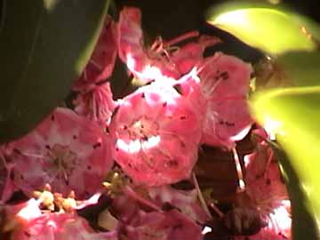 Mountain Laurel - Kalmia latifolia "The Native Americans used the wood for spoons...in fact, the name "spoonwood" has been used for this shrub. The wood carves nicely and the fine grain takes a good polish. The wood is also often gnarled so you can pick a place that bends the way you want your spoon or ladle to go!" Schoolyard Habitat The Mountain Laurel is a small tree or shrub with evergreen leaves. Its lovely spring flowers are white or pink with streaks of pink to red. Mountain laurel is poisonous. It sickens cattle that feed on it. It was used by Native Americans as a medicine for many illnesses. Botanical.com
